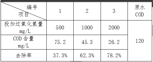 2、从表一的试验数据来看,当曝气时间为1hmin,加入2000mg/L的双氧水时,COD的去除效果最佳,该废水的COD可降至26.2mg/L,COD去除率高达78.2%。