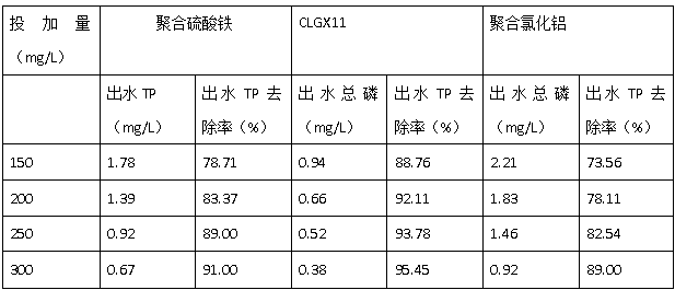 比对CLGX11除磷剂与市售混凝剂聚合硫酸铁和聚合氯化铝对深圳市龙岗区丁山河河水中总磷的去除效果,该废水外观呈现较浅的乳白色,带有悬浮物。其中pH为6.66,总磷(TP)质量浓度为8.36mg/L。