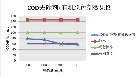3、根据试验结果,贵司废水净水剂+有机脱色剂用量在1600ppm才能降至64.71mg/L。而我司COD去除剂+有机脱色剂处理贵司废水COD浓度随投加量的增加直线下降,可使贵司废水稳定达到《纺织染整工业水污染物排放标准》(GB4287-2012)要求。